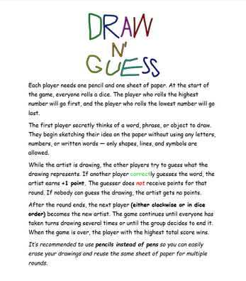 Draw N' Guess is a simple and fast-paced party game where players take turns drawing random words or phrases while others race to guess what the drawing represents. It requires almost nothing to play — just paper, pencils, and imagination.